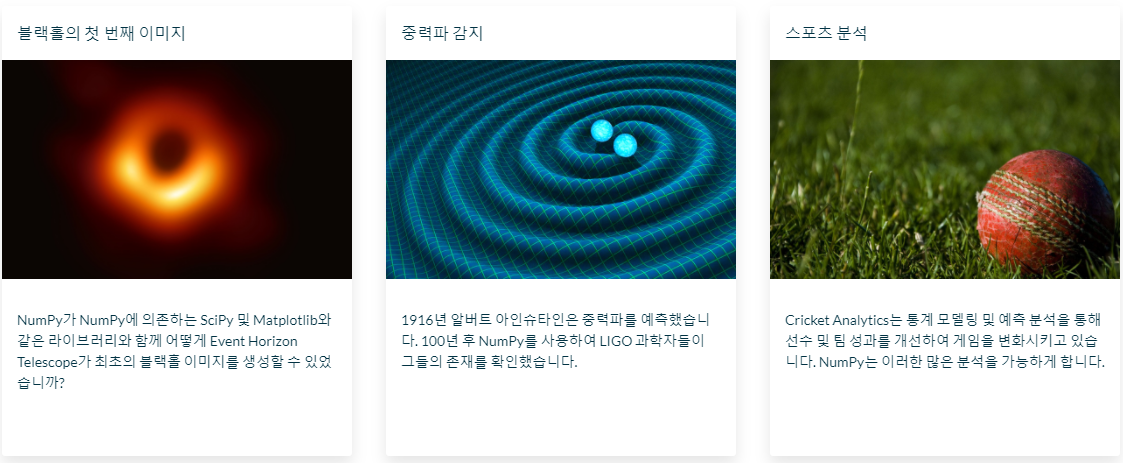 또한 선형 대수, 난수 생성기, 선형 대수학 루틴, 푸리에 변환 및 파이썬에서 행렬 및 n차원 배열과 사용되는 기능 등을 제공하고 광범위한 하드웨어 및 컴퓨팅 플랫폼을 지원하며 분산, GPU 및 희소 배열 라이브러리와 잘 작동을 합니다.