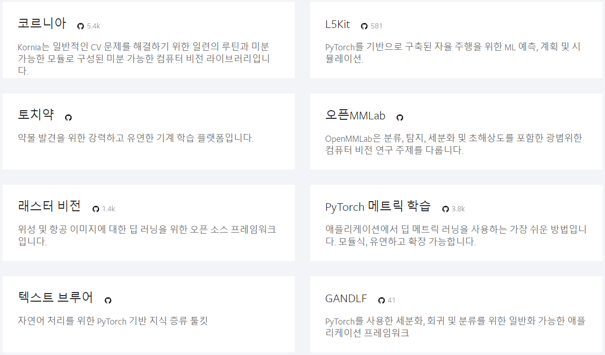 활발한 연구자 및 개발자 커뮤니티는 PyTorch를 확장하고 컴퓨터 비전에서 강화 학습에 이르는 영역의 개발을 지원하기 위한 풍부한 도구 및 라이브러리 에코시스템을 구축했습니다.