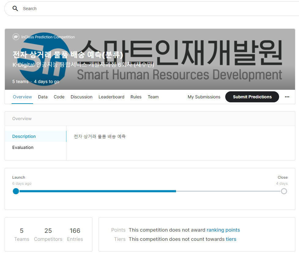 스마트인재개발원 5개월 교육과정중 벌써 3개월이 지나고 파이썬을 활용한 머신러닝 수업의 중후반 정도 배우는 중인데 팀대항으로 "전자 상거래 물품 배송 예측(분류)" 대회가 시작되었습니다.