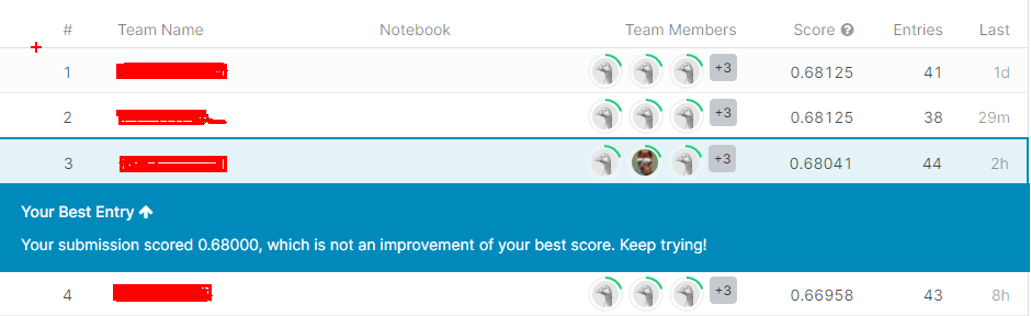 메뉴중 Leaderboard를 누르면 실시간 팀별 순위를 확인할수 있으며 팀명, Score, 제출건수, 최종 제출시간이 표시된다.