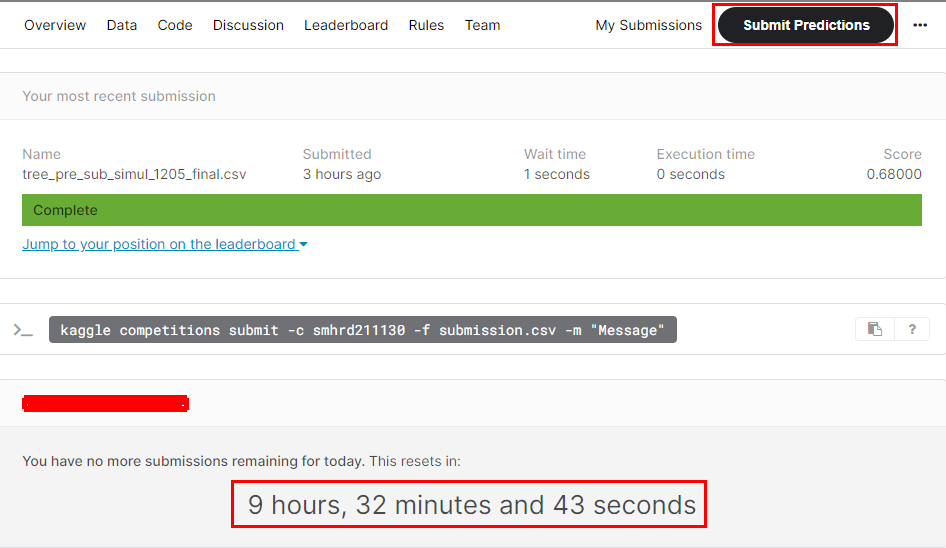 4. Submit Prediction을 10건 모두 소진하면 다음날 오전 9시에 10건이 다시 생긴다.