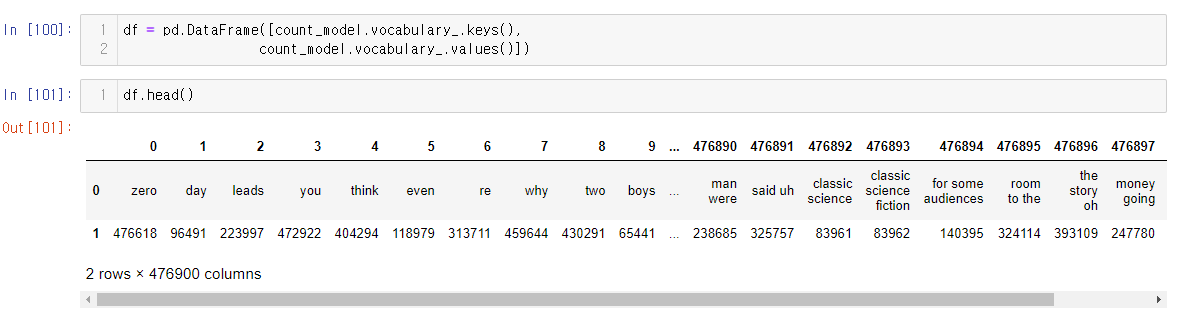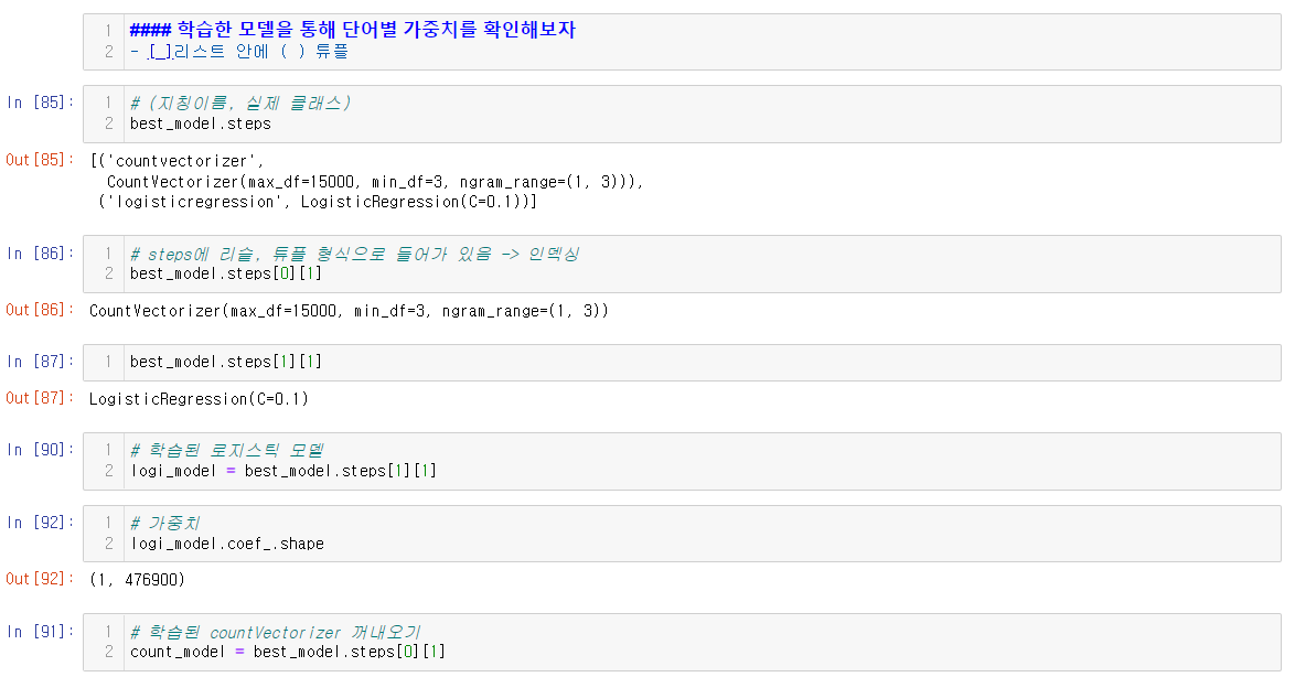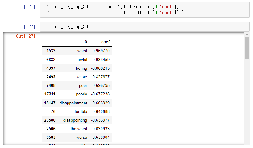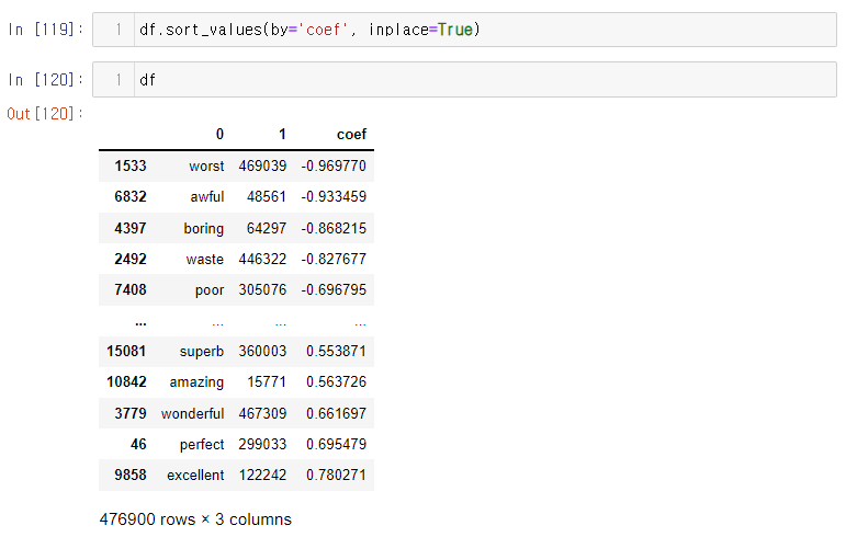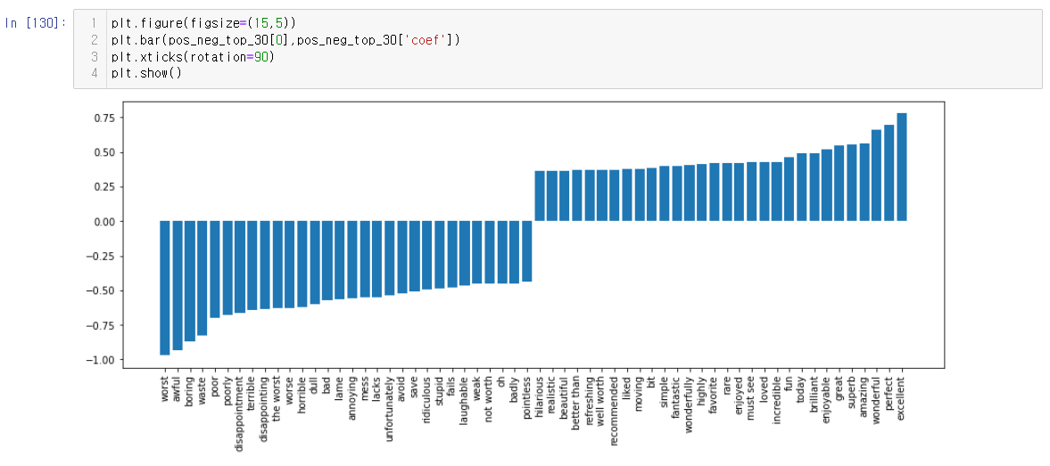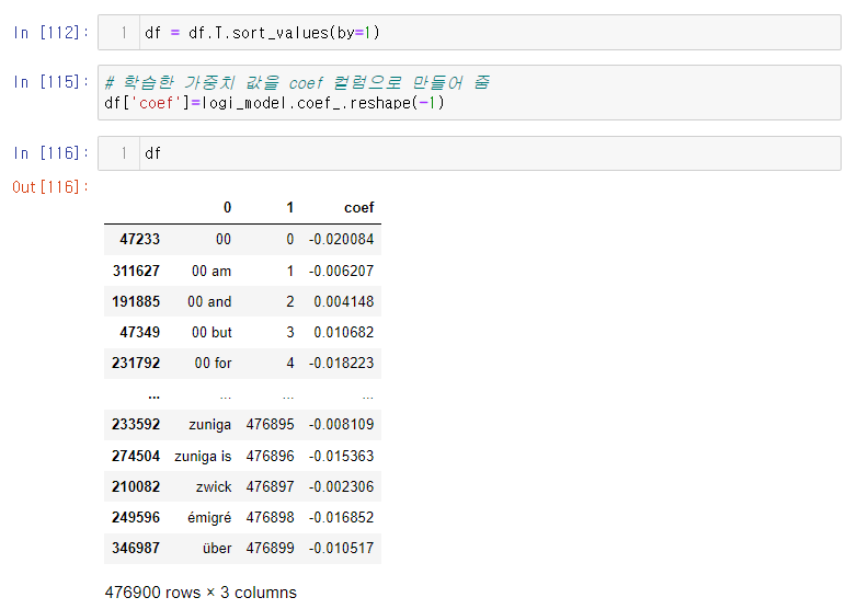 아래 coef(가중치)를 보면 -1에 가까울수록 부정에 영향을 미치는 단어이고 1에 가까울수록 긍정에 영향을 미치는 단어를 확인할수 있습니다.
