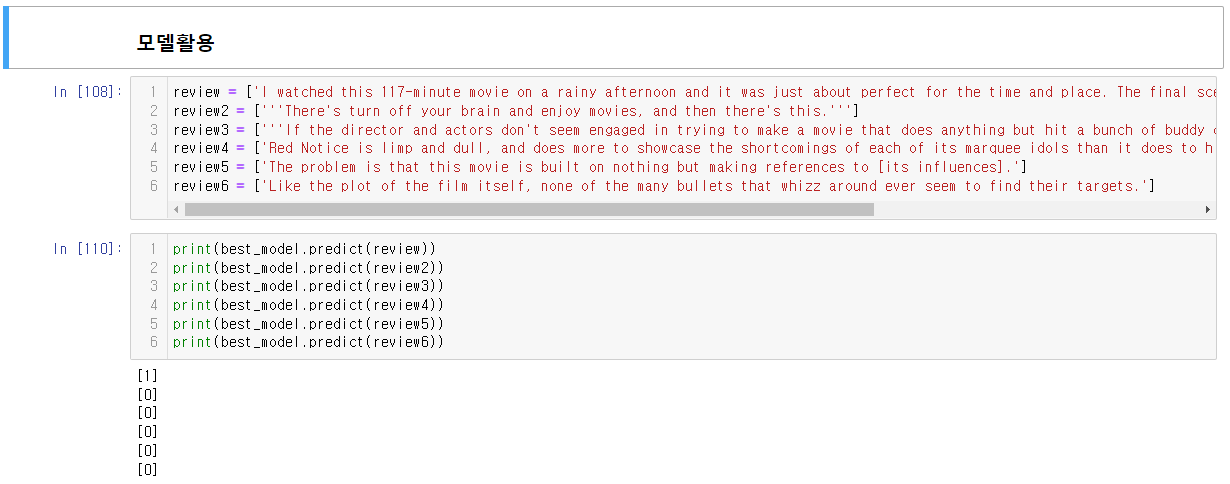 위의 리뷰 6개(첫번째만 긍정, 나머진 부정)를 한개씩 가져와 각각 review ~ review6에 할당을 해주고 예측을 해봤습니다. 예측결과는 6개 모두 정확하게 예측을 성공한걸 확인했습니다.