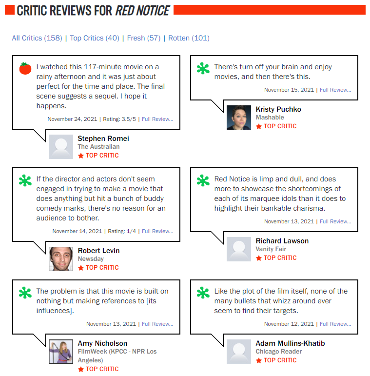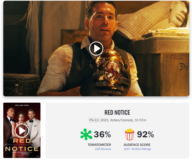 저는 영화 "Red Notice"를 저번주에 넷플릭스로 잼있게(킬링타임용) 봐서 리뷰내용이 부정과 긍정의 비율이 궁금해 리뷰내용을 가져와 예측을 해겠습니다.