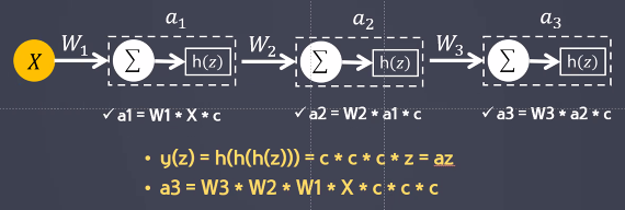 - 활성화 함수로 선형함수(ex. h(z) = cz)를 사용하면 중간층(은닉층)을 여러 개 구성한 효과를 살릴 수 없다.