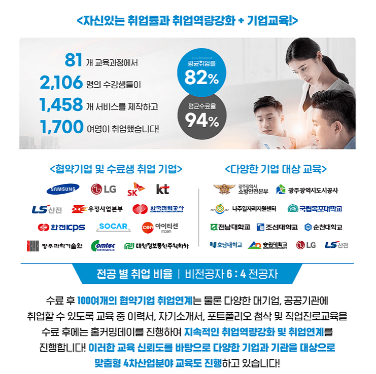 2020년 기준 수료율 96%를 달성하여 높은 수료율을 보여주고 있으며 2016년~2020년 까지 평균취업률 82%를 기록하며 기업에서 요구하는 수준의 인재를 꾸준히 배출하고 있습니다.