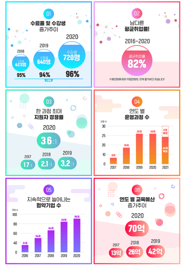 기업의 만족도가 높아 협약기업의 수도 매년 꾸준히 증가하고 있는 추세이며 높은 수료율과 취업률로 정부지원예산도 매년 증가하여 2020년엔 70억을 교육예산으로 지원받았습니다.
