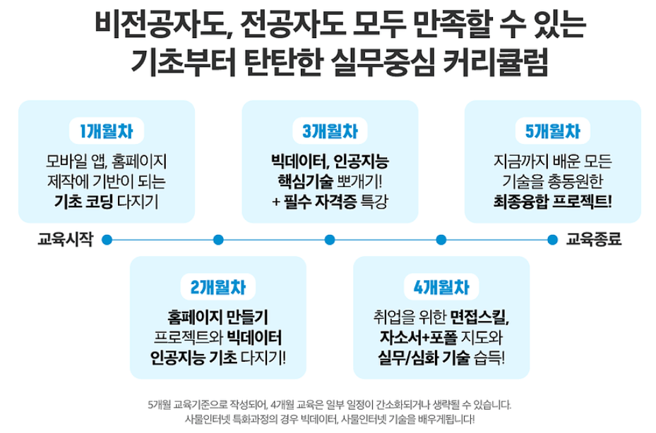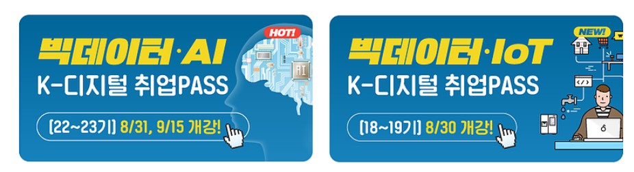 스마트인재개발원의 취업연계과정인 K-디지털 취업PASS (인공지능, 빅데이터, IOT)을 수료하면 취업연계가 되있는 100여개의 협약기업 및 다양한 다양한 대기업, 공공기관에 취업을 할수 있도록 교육중에 이력서 및 자기소개서, 포트폴리오를 첨삭 지원해주며 직업진로교육을 수료 후에도 진행하여 수료생들을 끝까지 책임져 주는 교육기관입니다.