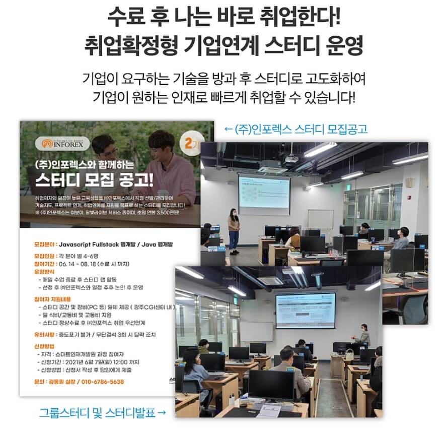교육과정은 잘 이수했는데 취업은 본인이 알아서 해야된다면 막연하게 취업준비를 하며 시간을 보내야되는데 스마트인재개발원은 과정수료와 동시에 취업연계를 지원해주니 정말 믿음이 가는 교육기관입니다.